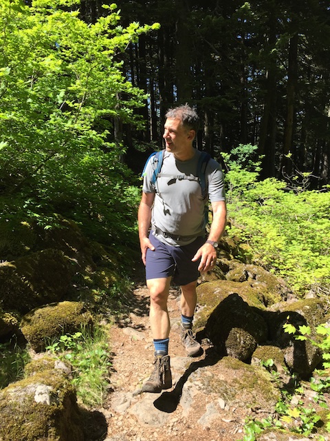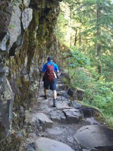 We got to Wahtum Lake within 5 hours; took 30 minutes for lunch; and, then powered back to the trailhead starting point 5 hours later.  I was huffing and puffing going up at our pace and coming down was easier, however, the rocky terrain kept us from increasing our pace.  I got stung by a bee going up and Michael did coming down.  We all tripped several times in the tricky terrain, but I was the only one to do a face plant.  Fortunately that happened in the soft forest terrain and not along a cliff edge.  I managed to bend one of my trekking poles though.