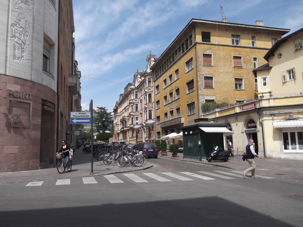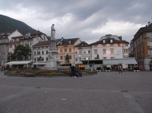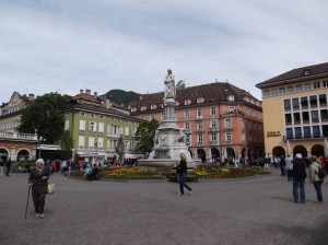 We maneuver to Bolzano and the GPS gets us to drive by the square where we spot the hotel. We spend about 10 minutes maneuvering to the garage and it seems we need to drive across some sidewalks. We see others do it so we proceed. We check into the Hotel Grief which is friendly and well situated on the main square, Piazza Walther.