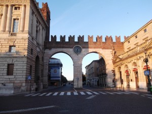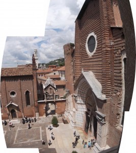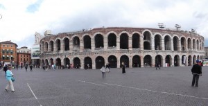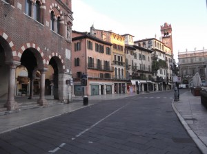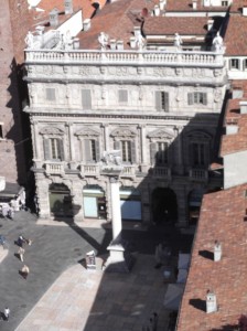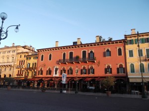 We set out exploring for a lunch spot and settle into a cafe, recommended by Claudio behind the Hotel’s front desk, on the Piazza Erbe (live webcam). This ends up being our prime space for dinner, banking, shopping, and etc. Most of the shopping alleys begin or end on this Piazza and it’s fun to watch the people. Nearby is the Piazza Bra which adjoins the arena.