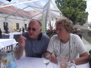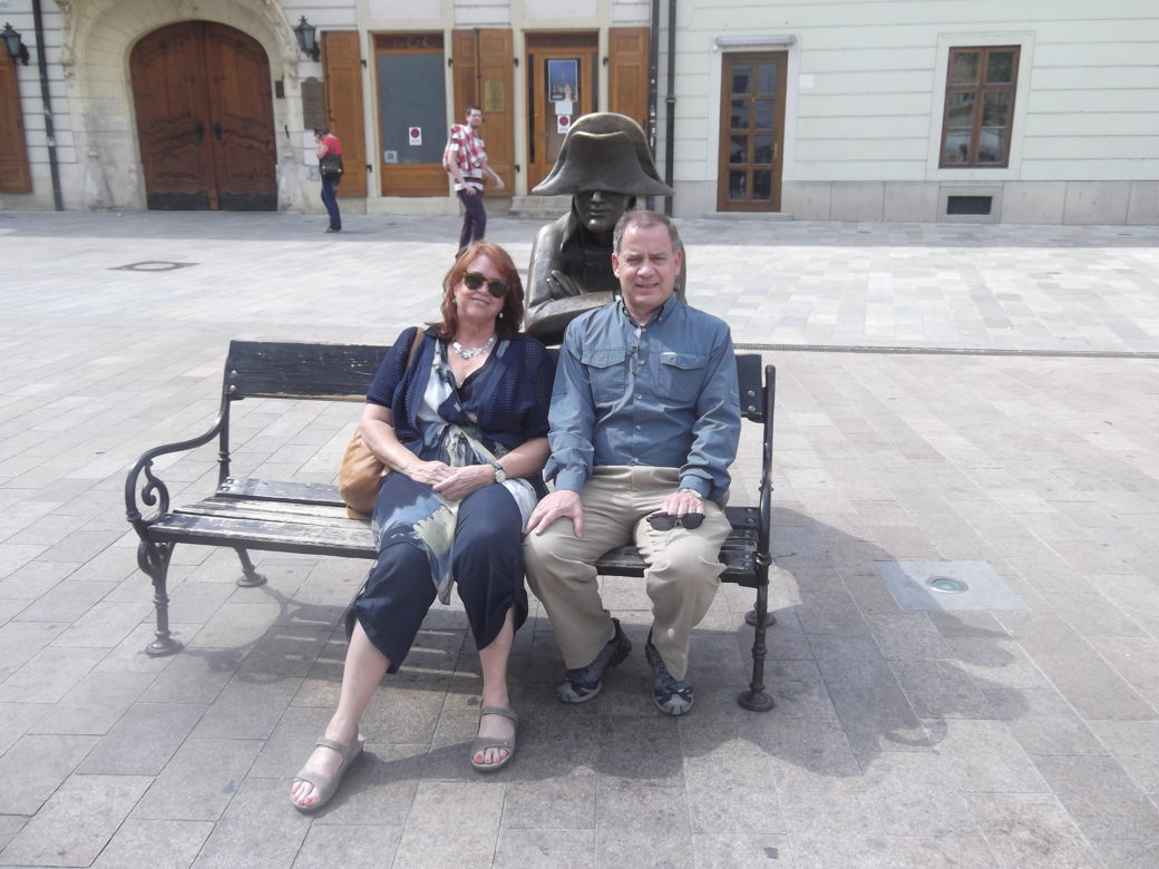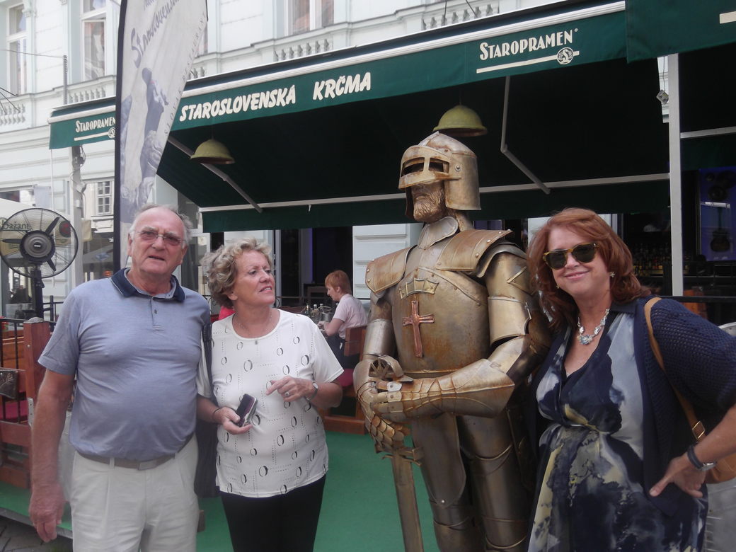 We arrive about lunch time at the castle overlooking Bratislava, officially known as Hrad Bratislava where hrad is the word for castle. We were walking around the castle and discovered a modern food festival ongoing, but decided to pass. So we decided to have lunch at the Hrad Restaurant on the balcony overlooking town. Our waiter spoke excellent English (he served on a tour boat for Americans) and we experimented with several foods. It was a terrific lunch with great weather and scenery.