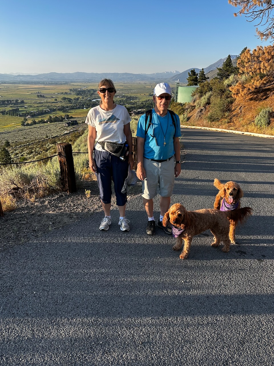 One huge benefit of our house in the old town district of Genoa is that it’s a great launching point for hiking in the Sierras. My favorite hike is starting from our front door and executing the Genoa Loop starting at the Eagle Ridge reservoir and ending at the Carson Street reservoir. The loop from our front door is just over 10 miles with about 1600′ differential elevation gain (2200′ elevation gain if one counts the ups and downs). My first time doing it last year was about 4;30. My best time this year was about 3:40. The dogs love it. My favorite weekends are when I can do the hike twice, once on Saturday and once on Sunday. I did this hike 19 times in 2023 for the months I was in Genoa. I consider this a major part of my efforts to stay fit.