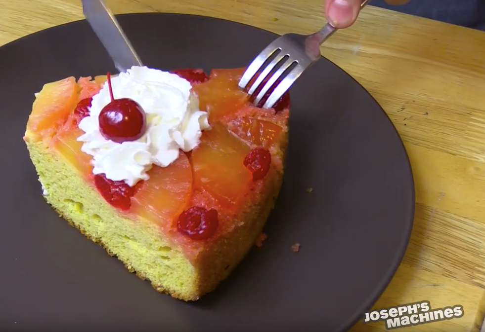 Joseph writes on this video:  “I hate waiting for dessert, so here’s a Rube Goldberg machine to streamline dinnertime. It lets me keep eating, with no break before cake. It’s my most complex yet and took 3 months to make so I hope you enjoy it!”