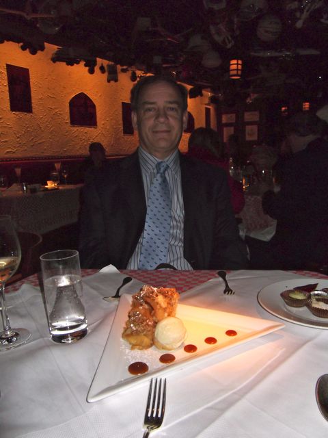 Later I met my daughter, Tabitha Colie, at 21 Club. It is a great restaurant (one of my top 10 based upon food and ambiance) with a hidden cellar. It was originally a speakeasy during prohibition that fell out of good graces with the power elite. The mayor ordered it shutdown but they could never find the alcohol. One time the police came with drawings for the building to look for hidden rooms. Still no luck. Turns out they put the cellar under the building next door and had a hidden 2 ton door carefully balanced to open for access. Now the restaurant is well known for its decoration in the bar (airplanes, trucks, helmets, etc.). In year’s past, you could keep a bottle of wine with them for later consumption. Example of bottles owned by celebrities who have passed away include Richard Nixon, Gerald Ford, John Astor, and Elizabeth Taylor (see my photo gallery). We started with Champagne, but had the Pouilly-Fuisse with dinner (one of my parent’s favorite). Tabitha had the Beefsteak Tomato Salad and the Dover Sole while I had Cornbread Crusted Crab Cake appetizer with the Open-Faced Lobster Ravioli. We also shared an Apple Crisp dessert. It was a great meal … too bad that Rich was still traveling back from his interview at Amazon.