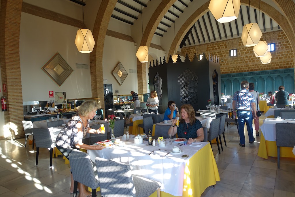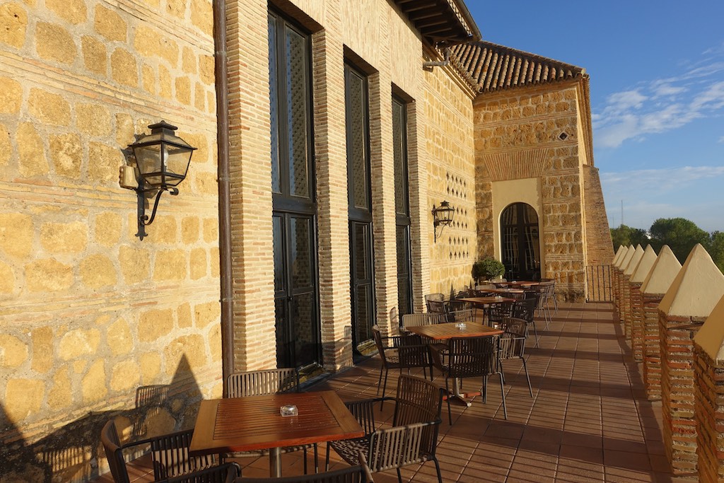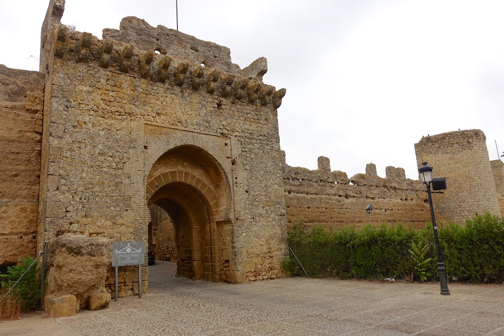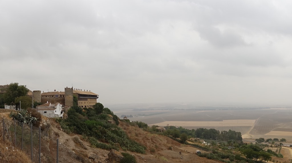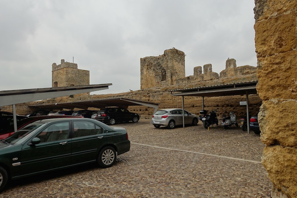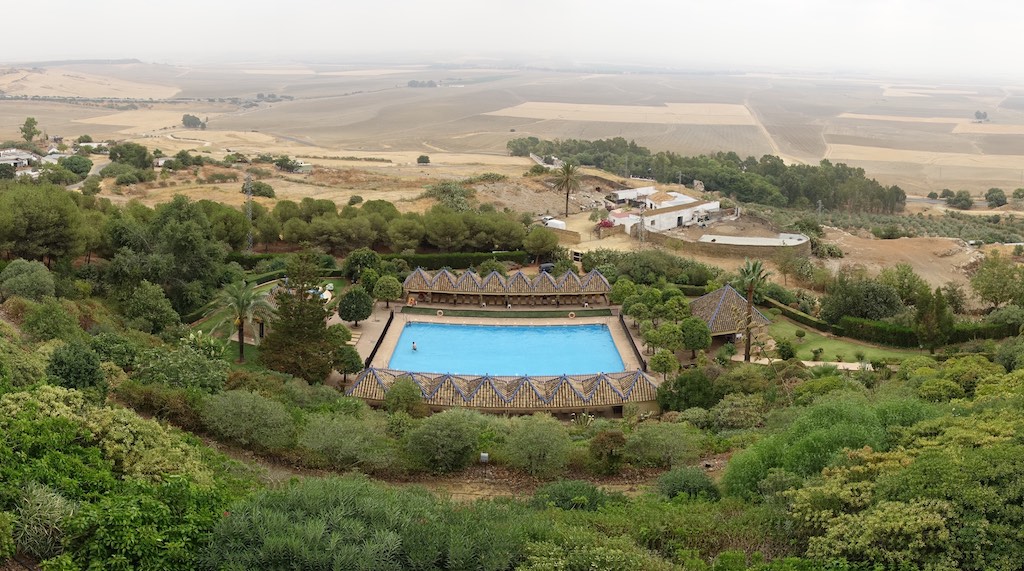 We drive past Seville and straight to the Parador 25km outside of town in a small town called Carmona (Parador de Carmona). This is the most picturesque ancient setting for a Parador yet. It is amongst the alcazar (“fort”) ruins where the walls of the ruins make up some of the walls and enclose the car park. Fitting into the car park is through a narrow arch cut into the wall. The Parador itself is perched on the edge of hill commanding a view of the surrounding countryside. We upgraded our rooms for 10 Euros to get a view.