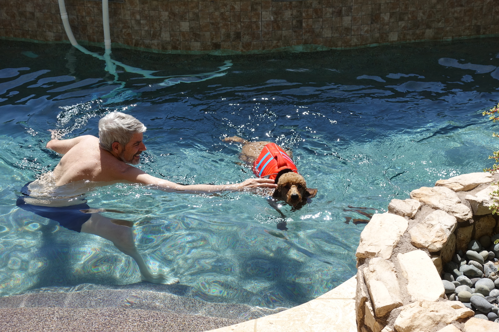 Brandy’s littermate and sister, Stella, joined us for swim-date today. Sharon McGill and Dan Riggs brought Stella over for pool familiarization.