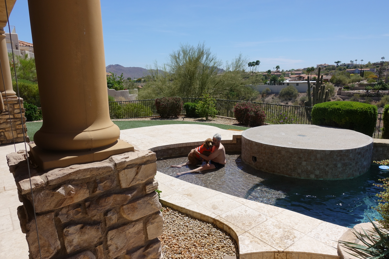 So our main goal was to get Stella comfortable in the pool and willing to play. Dan started out by just sitting with Stella for a bit in the shallow beach area (about 12 inches deep). After about 15 minutes he moved Stella to sit on the first step. Then after another 15 minutes or so he cuddled Stella and just walked her around the pool.