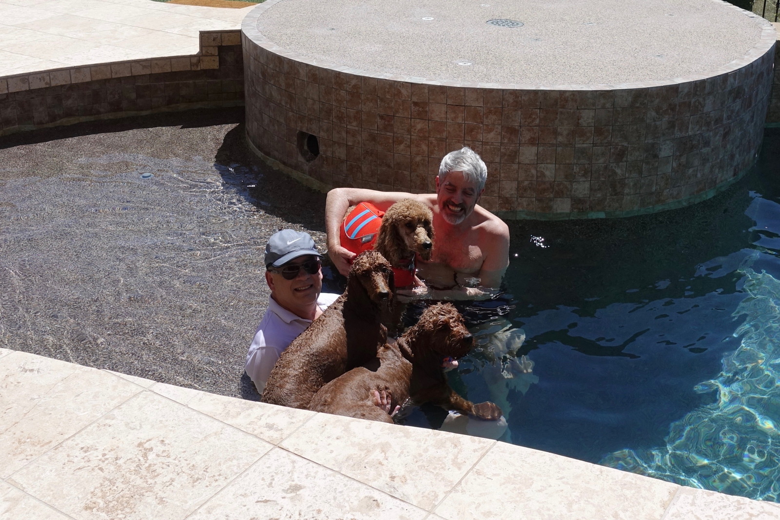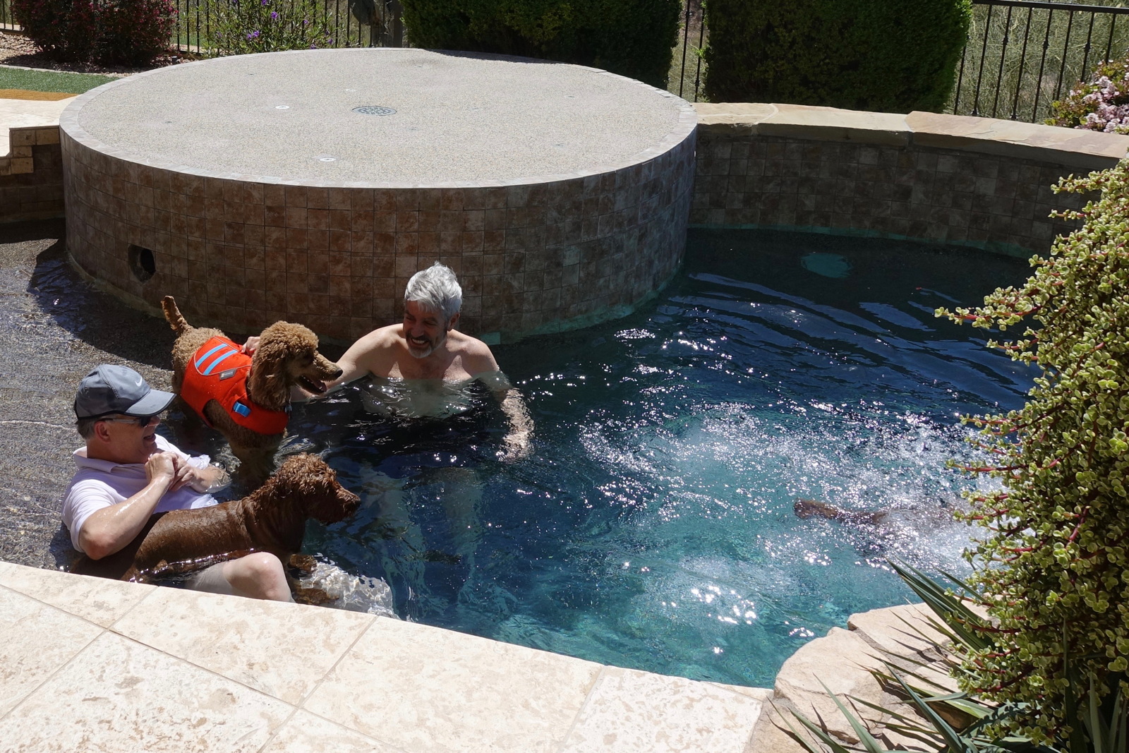 Brandy’s littermate and sister, Stella, joined us for swim-date today. Sharon McGill and Dan Riggs brought Stella over for pool familiarization.