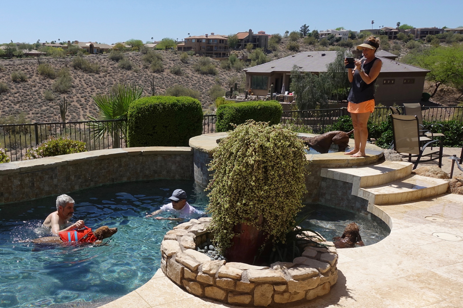 Brandy and Beckett swim or hot-tub most days now that they water is warm. Stella has really only been in or near a pool one time before. So we were hoping that their relaxed play would inspire Stella to enjoy.