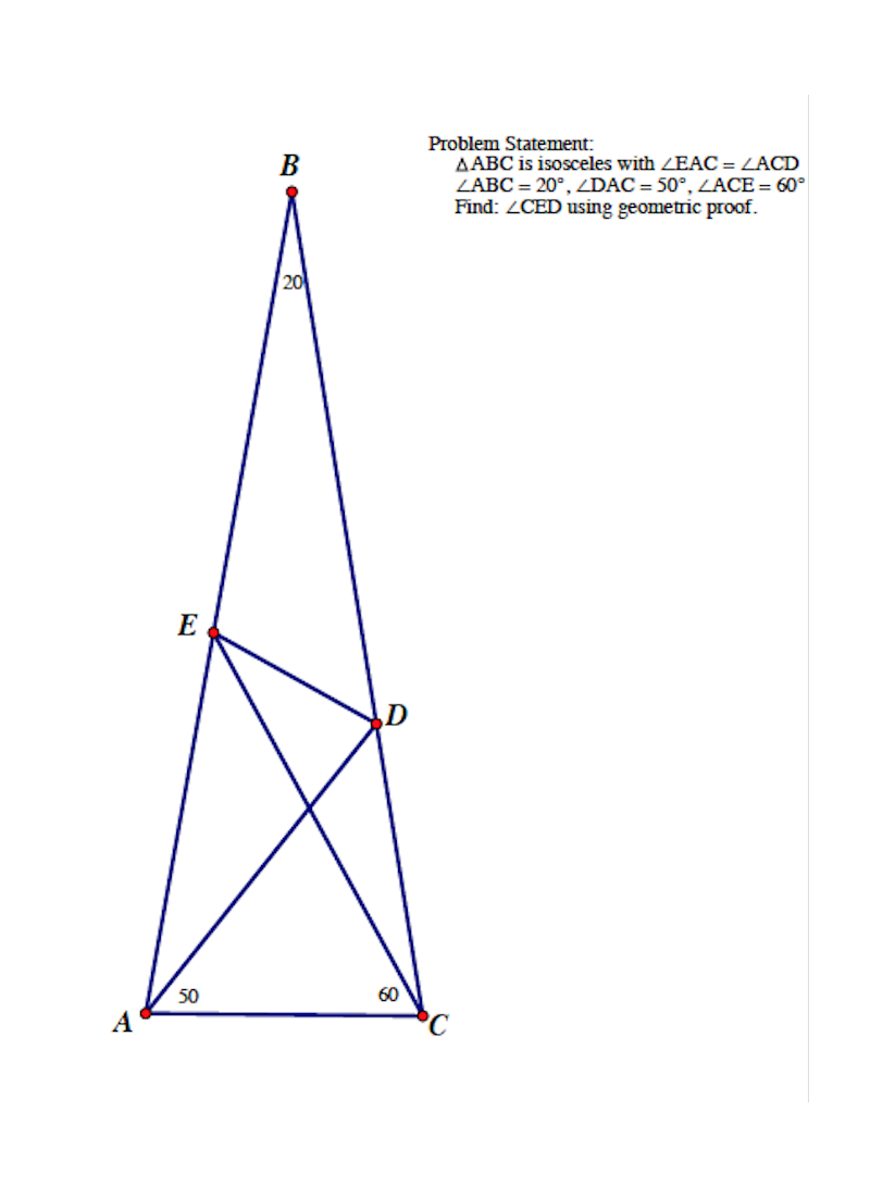 I am attaching the question and the solution to his entry. Although I did not get the solution via geometry as I reviewed the proof, it’s really not that difficult. There are no special theorems needed. One just needs think about the problem the right way. I have refined the proof here to make it even cleaner using Geometer’s Sketchpad.