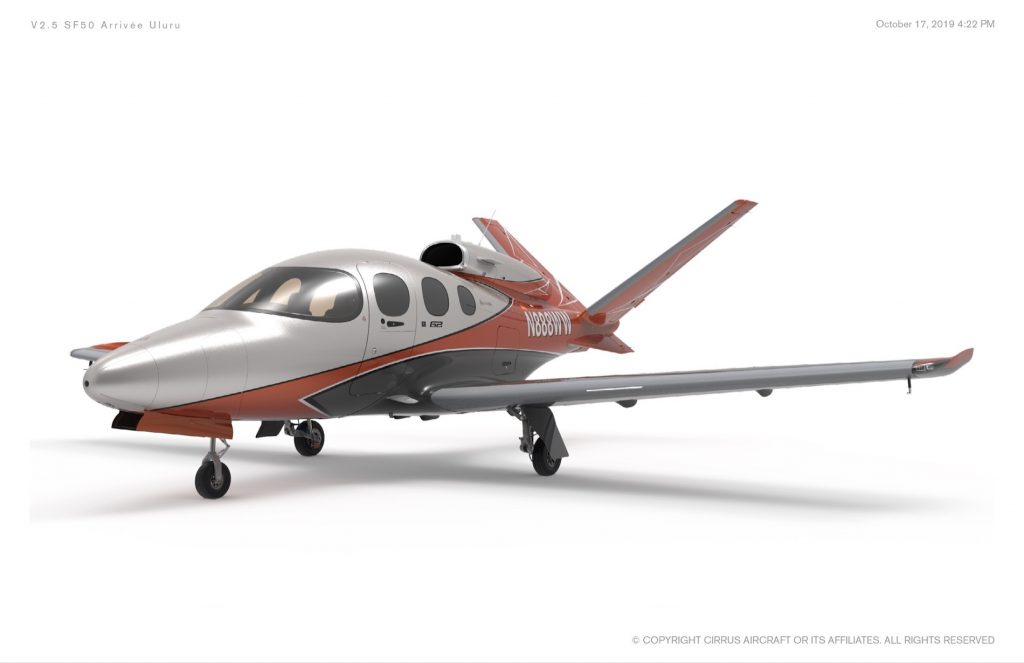 Nancy picked the semi-custom scheme called the Uluru for her new Cirrus Vision Jet SF50. Additionally, she has chosen the tail number N255M. She likes the fewest possible syllables and 5 is her favorite number. She got two fives and one of the two single-syllable letters, M for Mike.