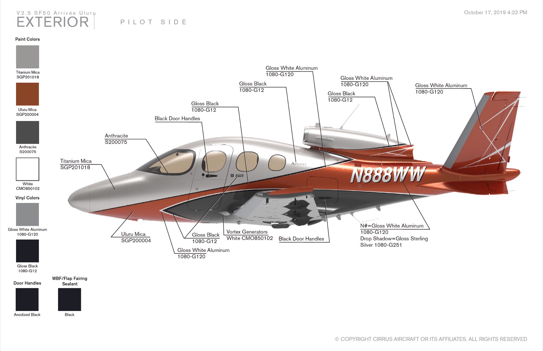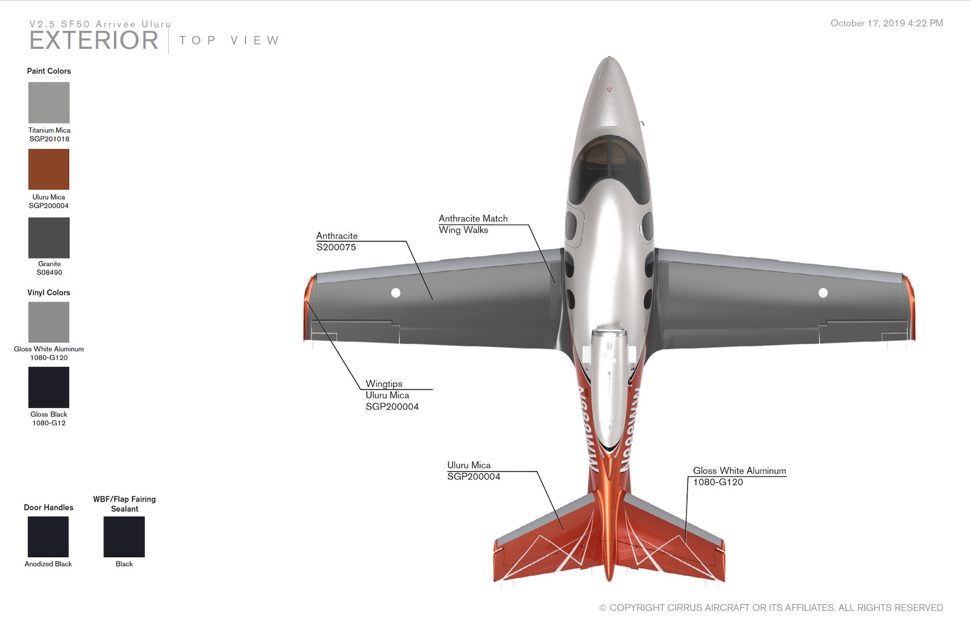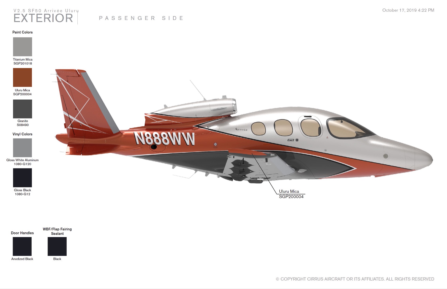 Nancy picked the semi-custom scheme called the Uluru for her new Cirrus Vision Jet SF50. Additionally, she has chosen the tail number N255M. She likes the fewest possible syllables and 5 is her favorite number. She got two fives and one of the two single-syllable letters, M for Mike.