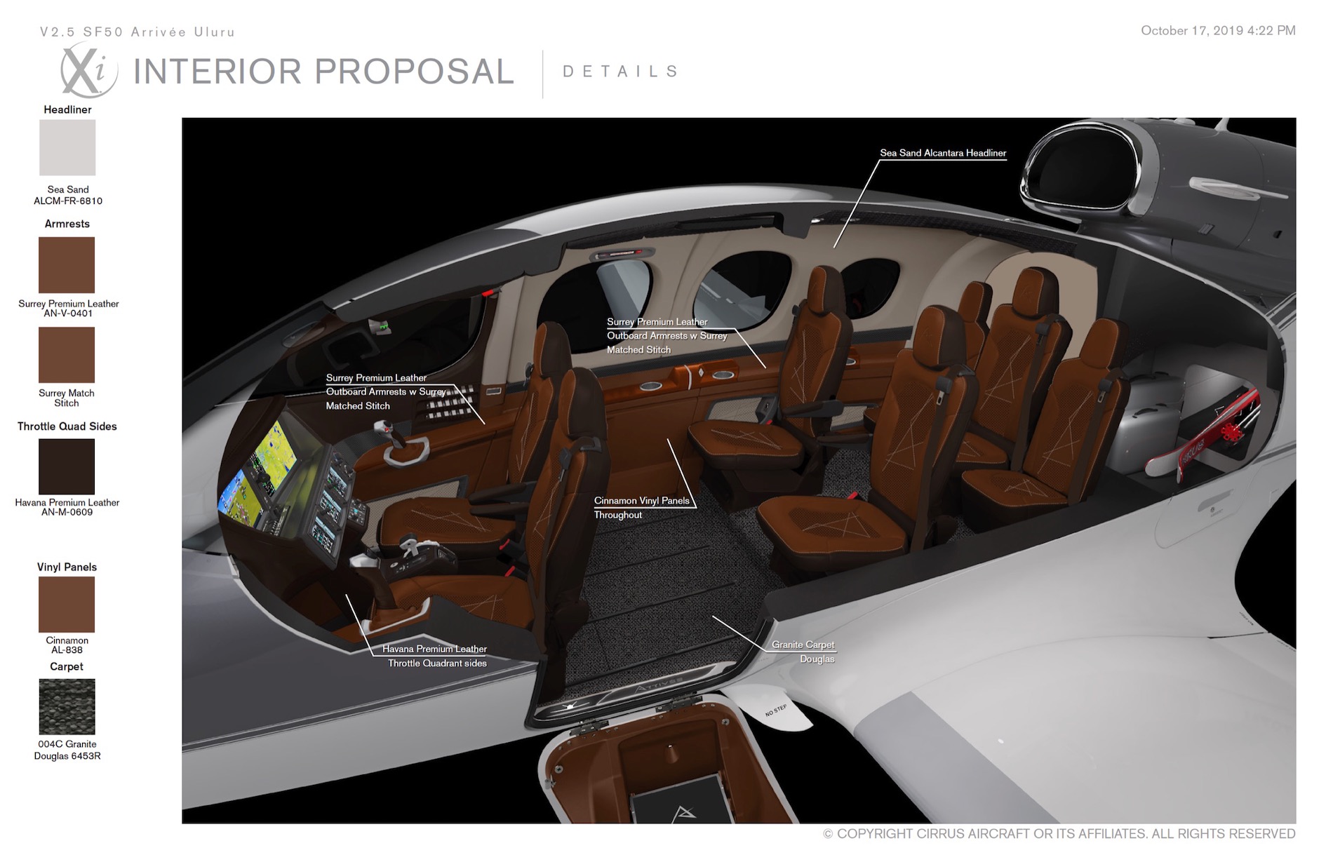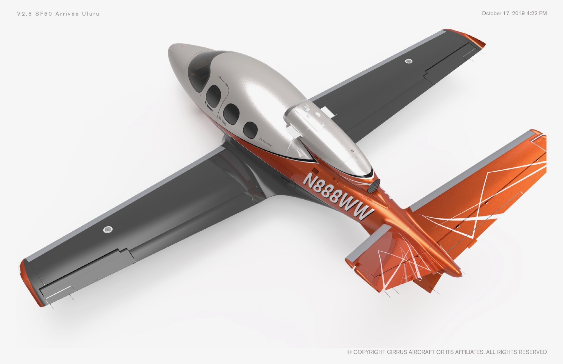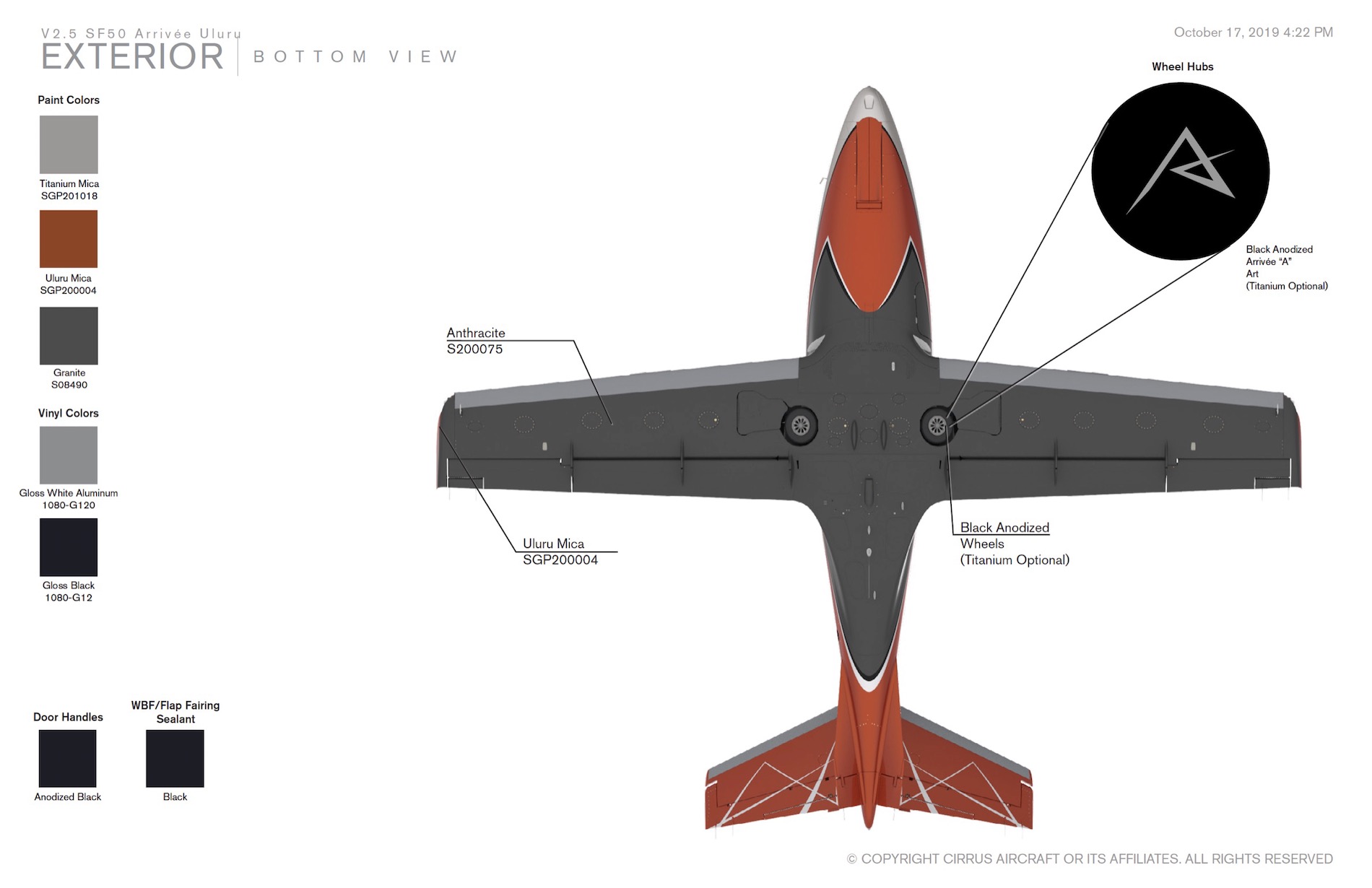 Nancy picked the semi-custom scheme called the Uluru for her new Cirrus Vision Jet SF50. Additionally, she has chosen the tail number N255M. She likes the fewest possible syllables and 5 is her favorite number. She got two fives and one of the two single-syllable letters, M for Mike.