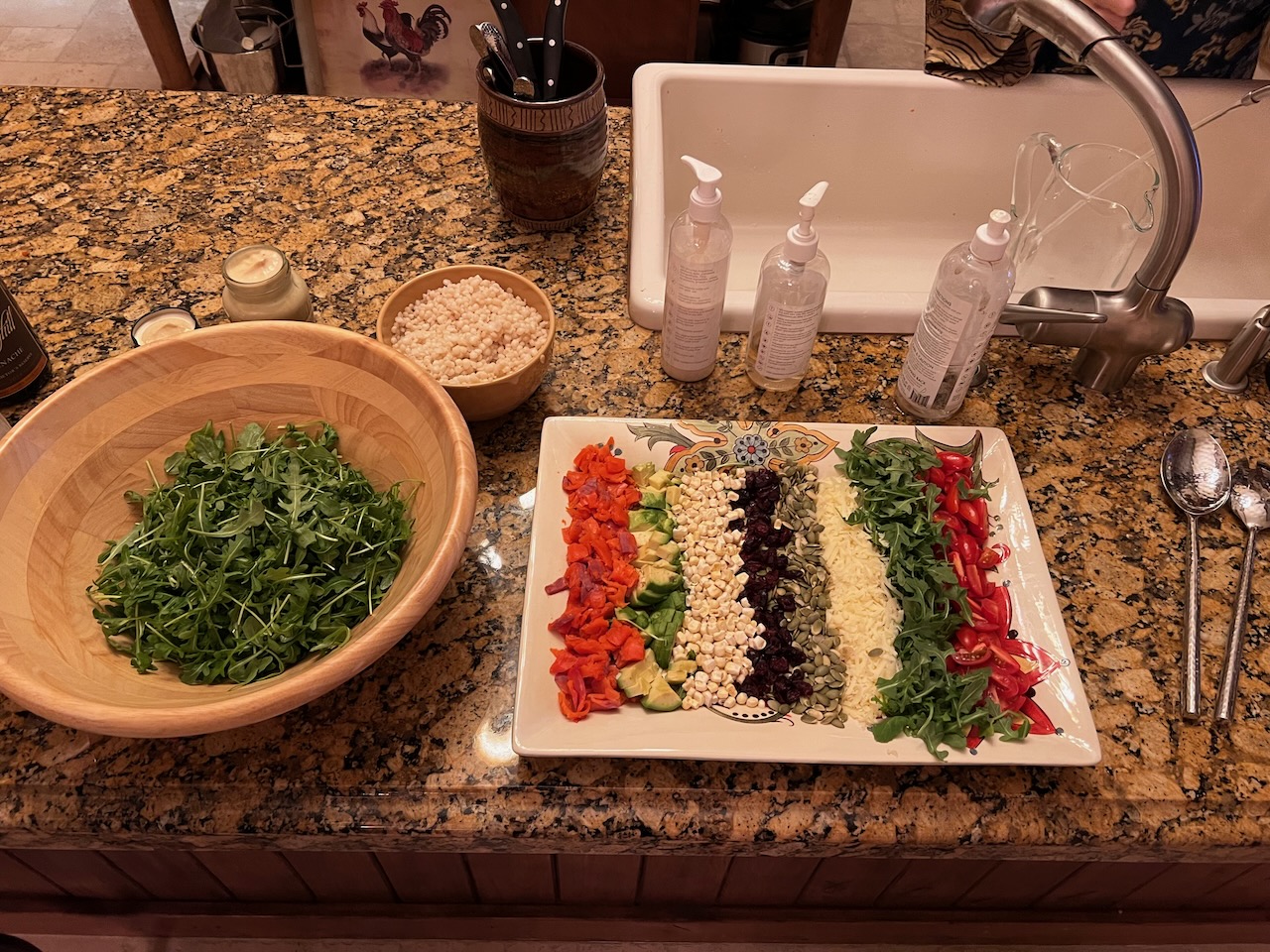• Wendy did lots of cooking for the group including:  Kale Salad, Vegetable Tahini, and Buffalo Cauliflower.  She also introduced us to a clever kitchen trick of putting a layer of cheese on left-over salads, veggies, rice, etc., and cooking in the microwave.  Adding chips and salsa and you have what I call ‘kitchen sink’ nachos.  Yummy.  I introduced them to Spicy-O’s (Terra Verde Foods), which makes everything taste better.  They agreed.